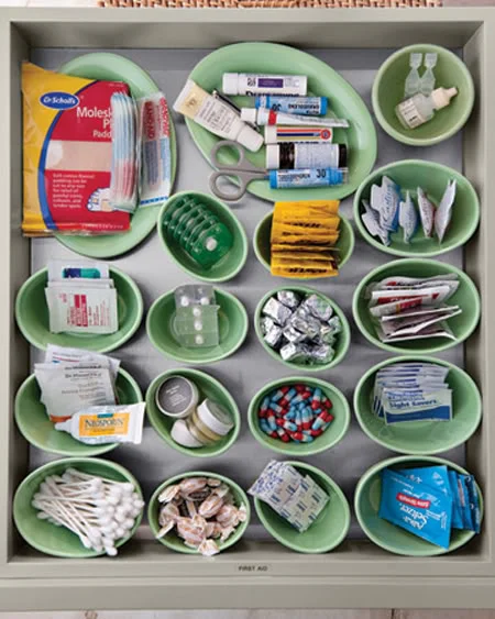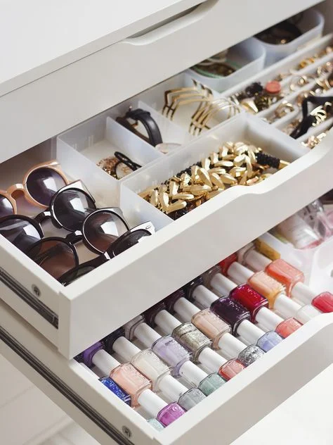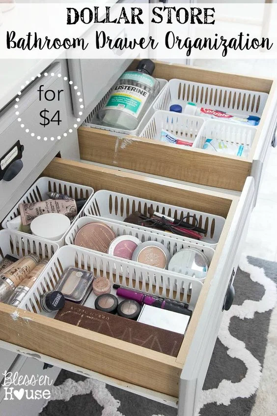 Getting the drawers organised doesn't have to be expensive either - clear storage tubs, narrow plastic baskets, and small bowls can be picked up from your local dollar store at a very low cost. It's a good idea to measure the space you're working with before purchasing any products, to make sure they'll fit and you're best utilizing the space you have.