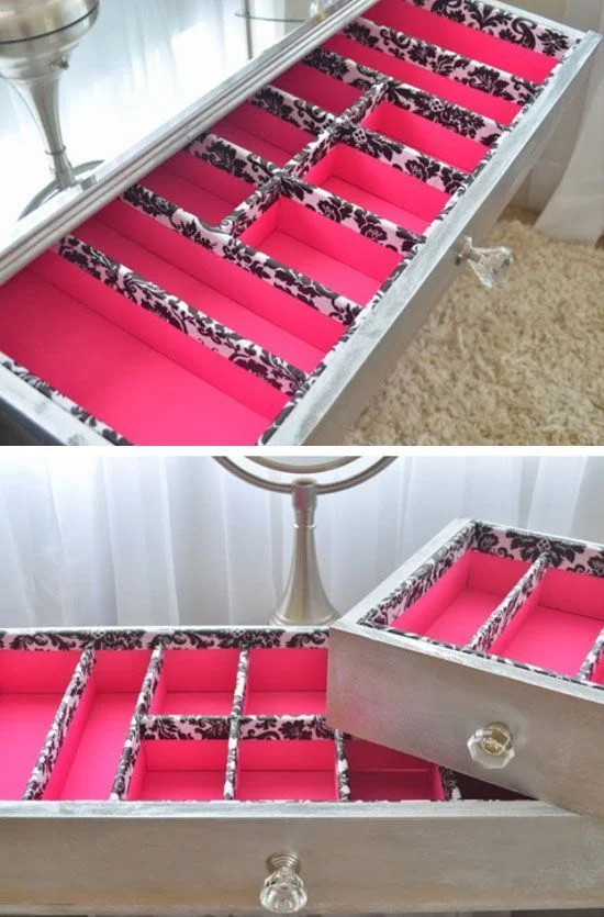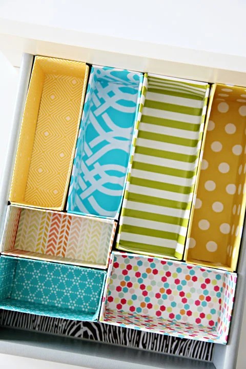 It can be easy and inexpensive to create your own simple and effective drawer dividers! Why not try covering old food packets and cereal boxes with craft paper for a perfect-fitting drawer solution (I did this with my stationery drawers). Or make some removable wooden dividers that will perfectly fit the contents. Customize a wooden tray with coloured contact paper, or use boxes and gift paper or material to create a look that's truly your own.