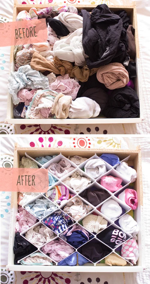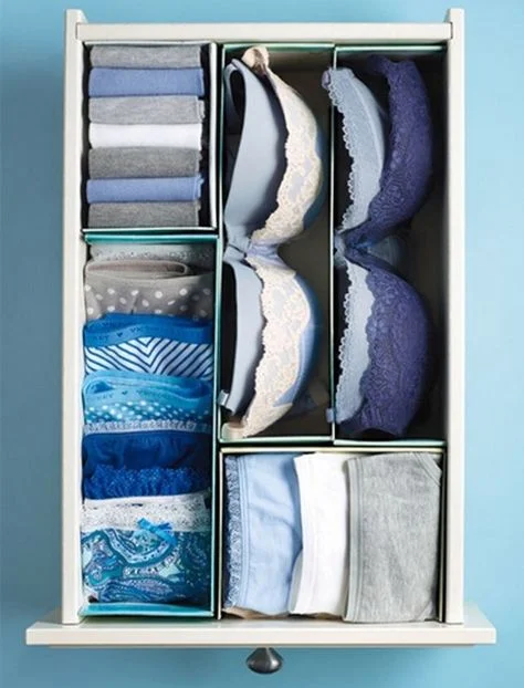 Dividers in the wardrobe are best for smaller items such as socks, underwear, bras and tights.You could also use dividers for belts, scarves and jewellery to keep everything neat and easy to find what you need. You could have a separate compartment for each of these items (as shown below), or just choose to separate each clothing category into its own box. Shoe-boxes or lids are a perfect and inexpensive solution! A nursery or child's bedroom will also really benefit from dividers as everything is so small and tends to easily get jumbled up!