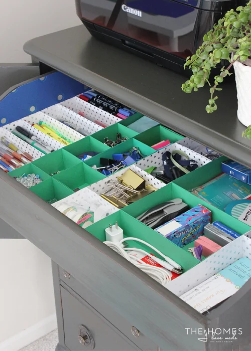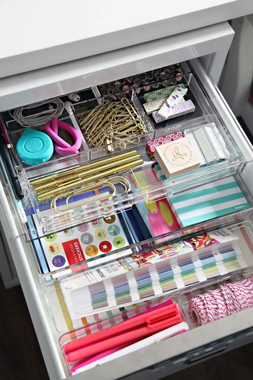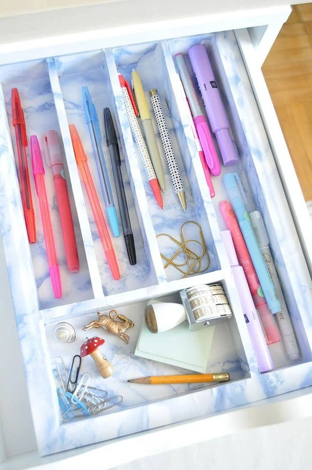The home office is an area that definitely needs to be organised in order for you to be as productive as possible, especially if you work from home. Fitted dividers, acrylic trays, small boxes, or even DIY cardboard compartments make everything easy to find. Lining the bottom of the drawer with a colourful paper or fabric will encourage you to keep the contents looking neat too!