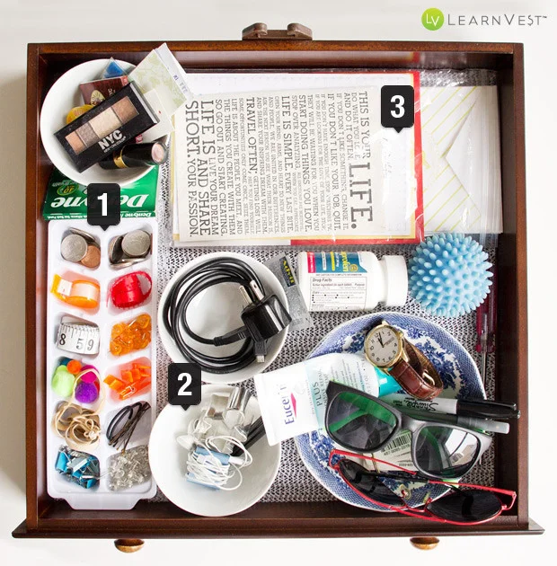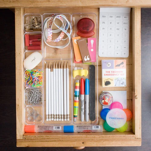 However, sometimes there are those bits and pieces that are more difficult to organise - so it pays to use some sort of divider to corral these items. There are loads of simple and creative ideas for doing this - why not try acrylic trays that clip together, small bowls, an ice-cube tray, or double-layered storage trays to fit your drawer and divide everything into clear categories. You'll find lots of great storage options at your local stationery store.