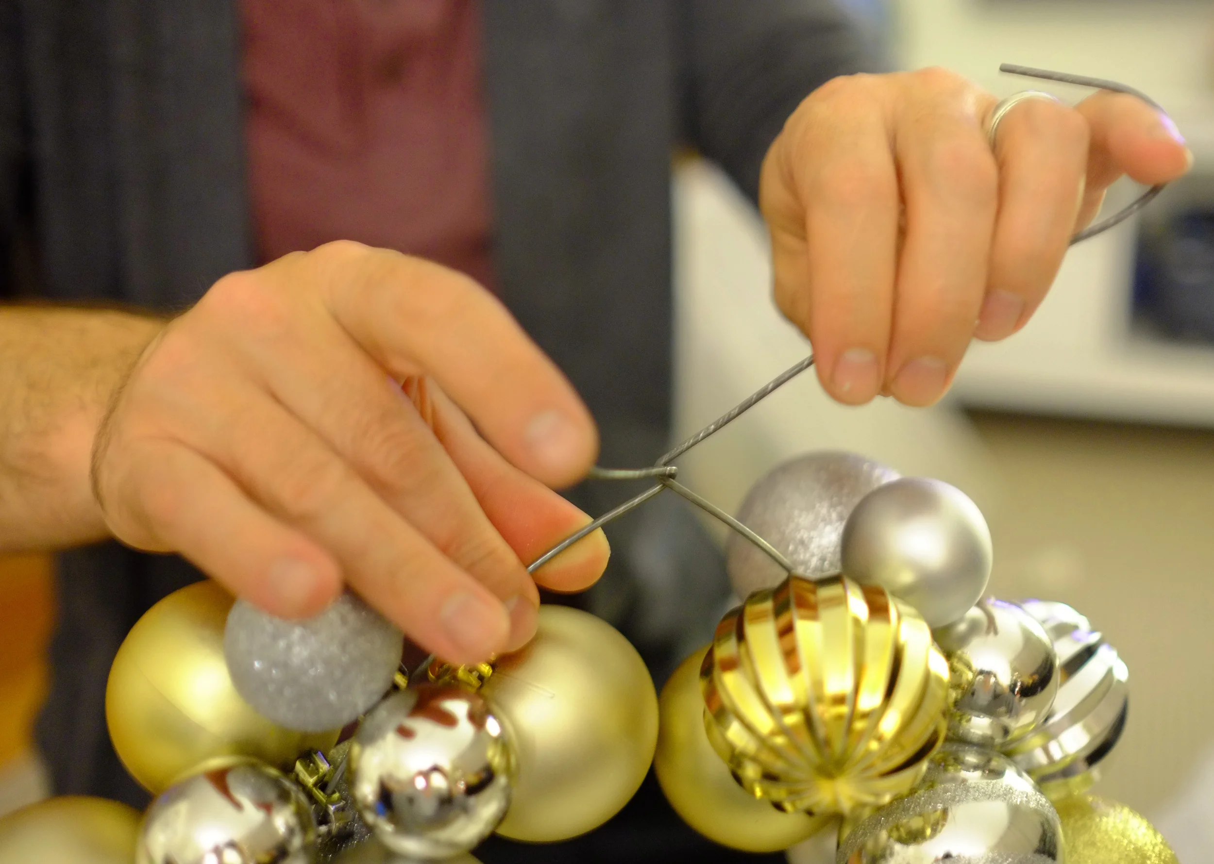 Because you could still see the wire, I wound on some gold ribbon so it would blend in with the bauble colours.