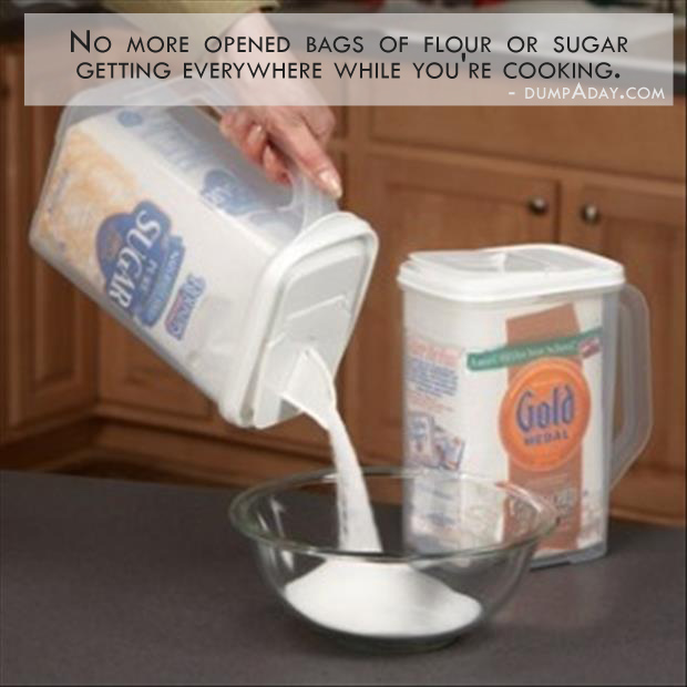 Pop any open packets of sugar or flour inside a lidded jug with an easy-pour opening to keep everything fresh and make it easy to pour out the exact quantity you need without spillage.