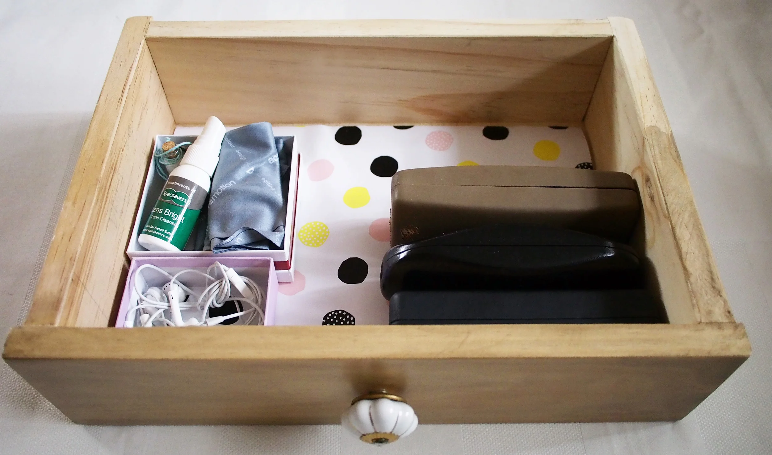 I swapped out the Tupperware freezer containers that I'd temporarily put in this drawer as I needed them back in my freezer! I found these ones in my 'small box' collection, and just lined the bottom of them with the same gift wrap as the drawers.