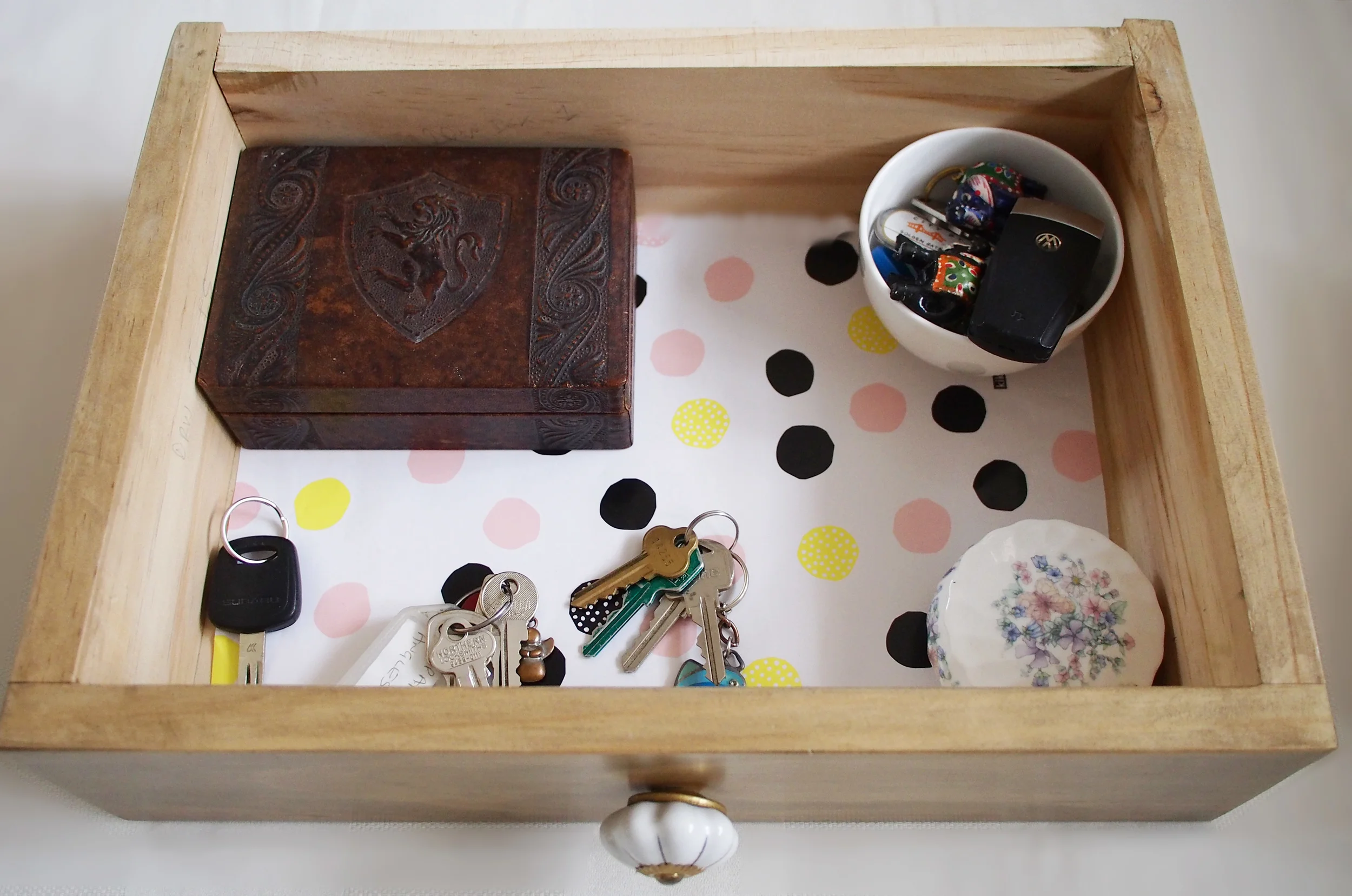 I always take my jewellery off at night, as I find sleeping with rings on quite uncomfortable. I keep my rings, watch and necklace in our console drawer in the Wedgewood bowl on the right. It was a gift from my beautiful cousin (who was also my bridesmaid) on my wedding day, so it is very special.